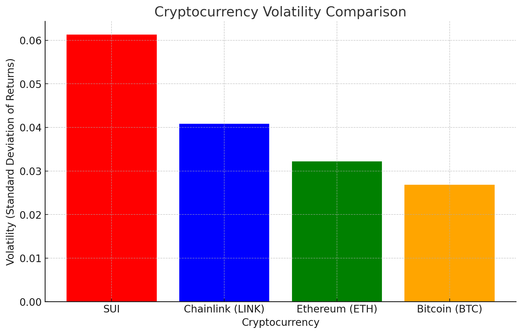 Looking at volatility, we see that the coin with the highest volatility is SUI. A 0.06 volatility means that, on average, the daily return of SUI fluctuates by 6% around its mean daily return.