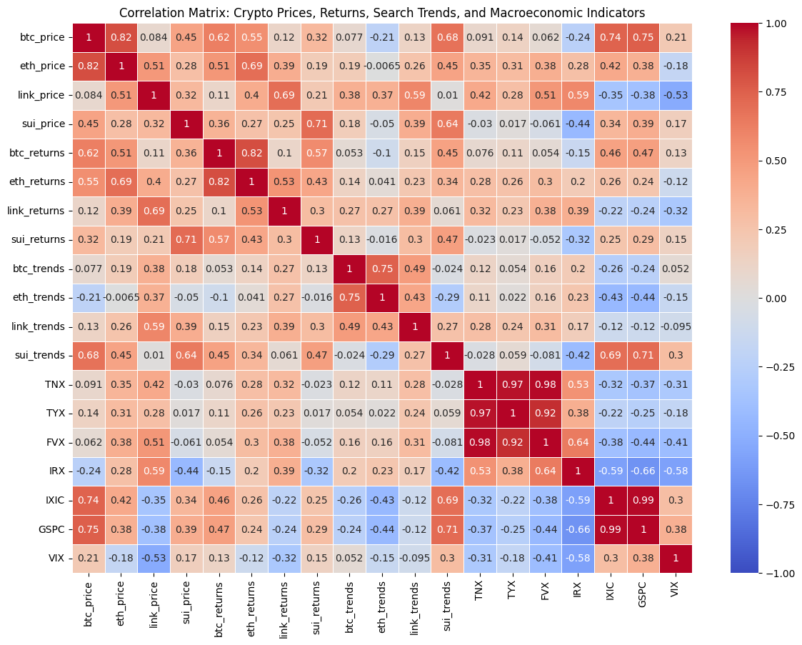 - ETH BTC and Chainlink have weak correlations to their Google Search Popularity, while SUI has a semi-strong one (.64).