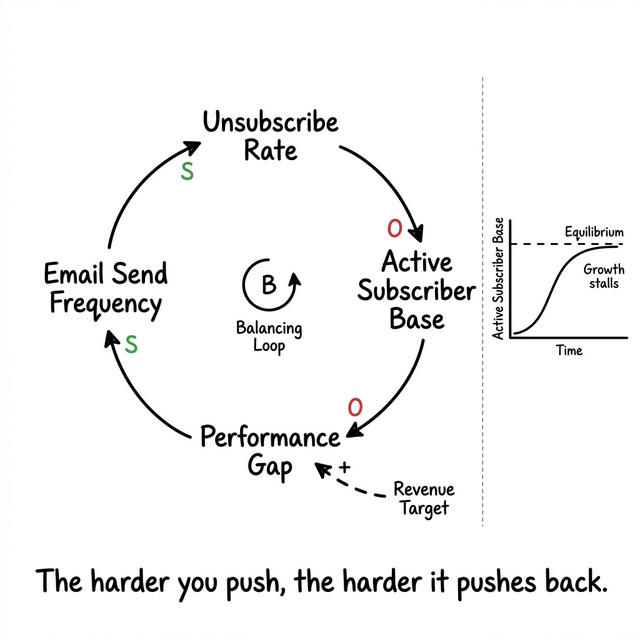 To hit a quarterly revenue target, your team increases email send frequency. The higher frequency drives up the unsubscribe rate, draining your active subscriber base back down. Net growth stays flat. The system self-corrected to resist your intervention.