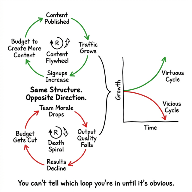 - Running out of fuel: You are struggling to generate the same level of activity you used to (e.g., traffic is down, content output is stalling). Your reinforcing loop is simply losing its momentum. You need to restart the engine.