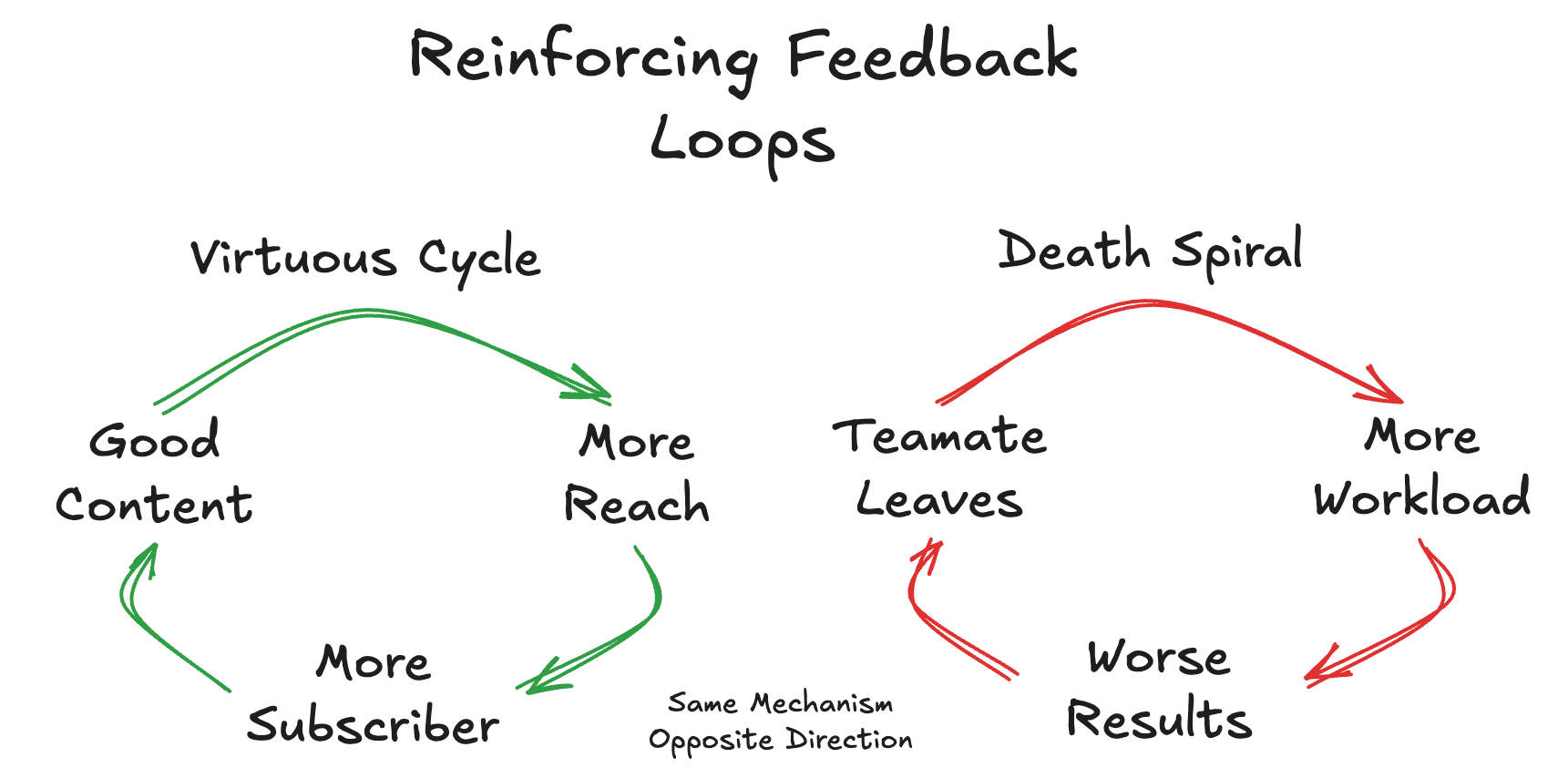 The thing that makes reinforcing loops dangerous is that the mechanism is identical in both directions. The content flywheel and the team death spiral are structurally the same loop — one just has a positive stock change and the other has a negative one. Most teams can't tell which one they're in until it's obvious.