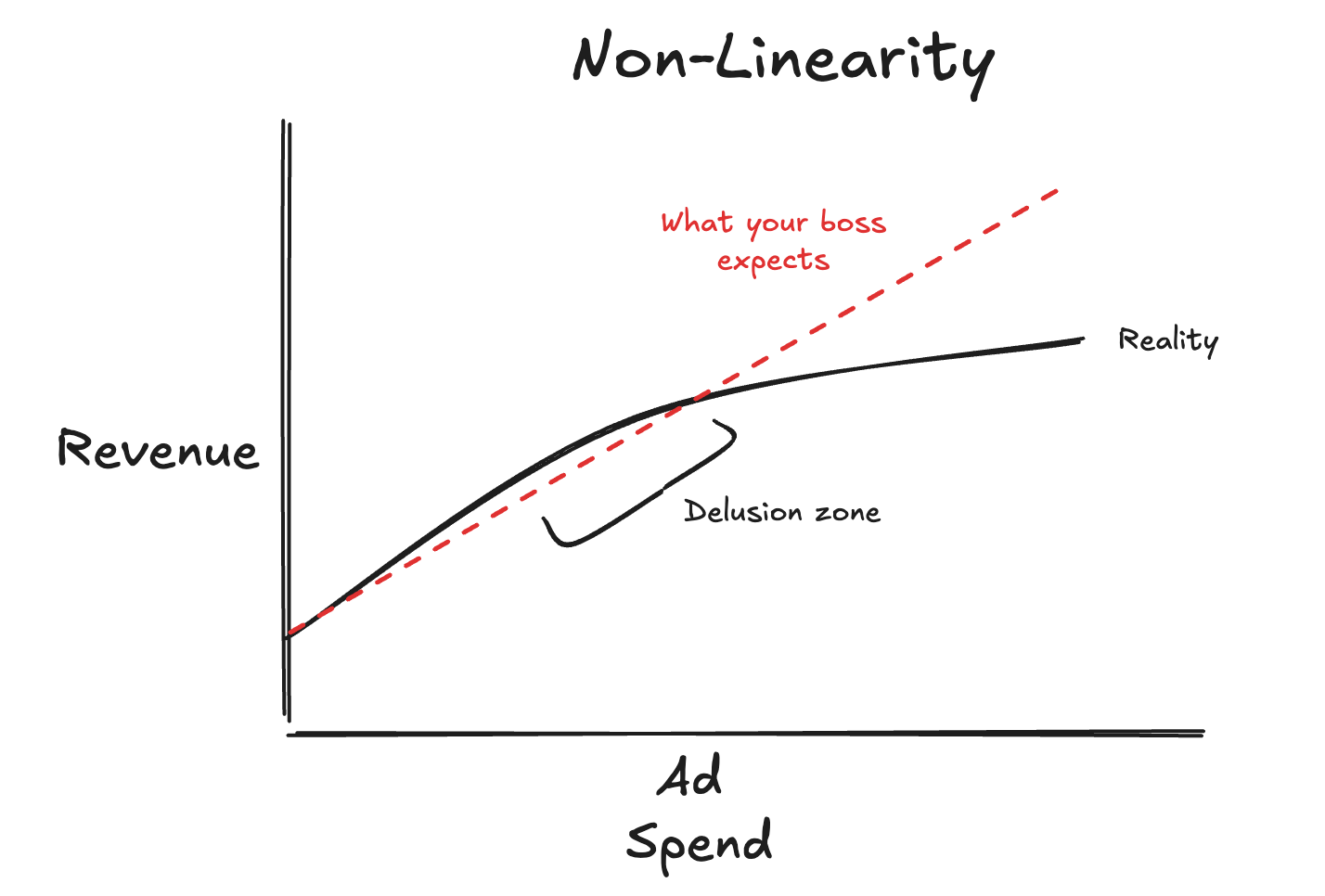 Most marketing measurement assumes linearity: that every dollar contributed equally. Incrementality testing and MMM exist precisely because that's not true. It's an attempt to measure where you actually are on the curve, not where the average says you are. Andrew Chen calls this the Law of Shitty Clickthroughs — performance degrades over time as it saturates.