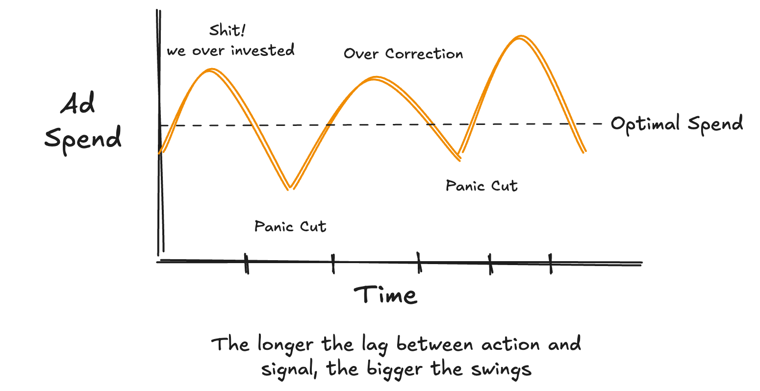 Spend goes up, results don't move (because the system hasn't responded yet), someone panics and cuts. Results finally start coming in from the previous spend, but too late — the cut already happened. Next quarter, they over-invest to compensate. Rinse, repeat.