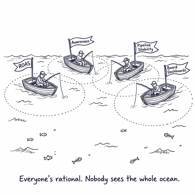 The performance marketing team sees that bottom-funnel search has 5x the ROAS of brand display. Rational move — cut brand display, reallocate to search. Six months later, search ROAS is declining and nobody can explain why. What they couldn't see from their slice of the system: brand display was feeding the top of the funnel that search was converting. They optimized their part and starved the whole.