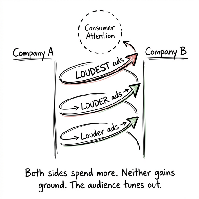 Escalation is a reinforcing loop between competing actors. Each side raises the stakes in response to the other. Price wars, feature wars, ad-spend wars. Both sides spend more to maintain the same relative position while the shared resource (consumer attention) degrades.