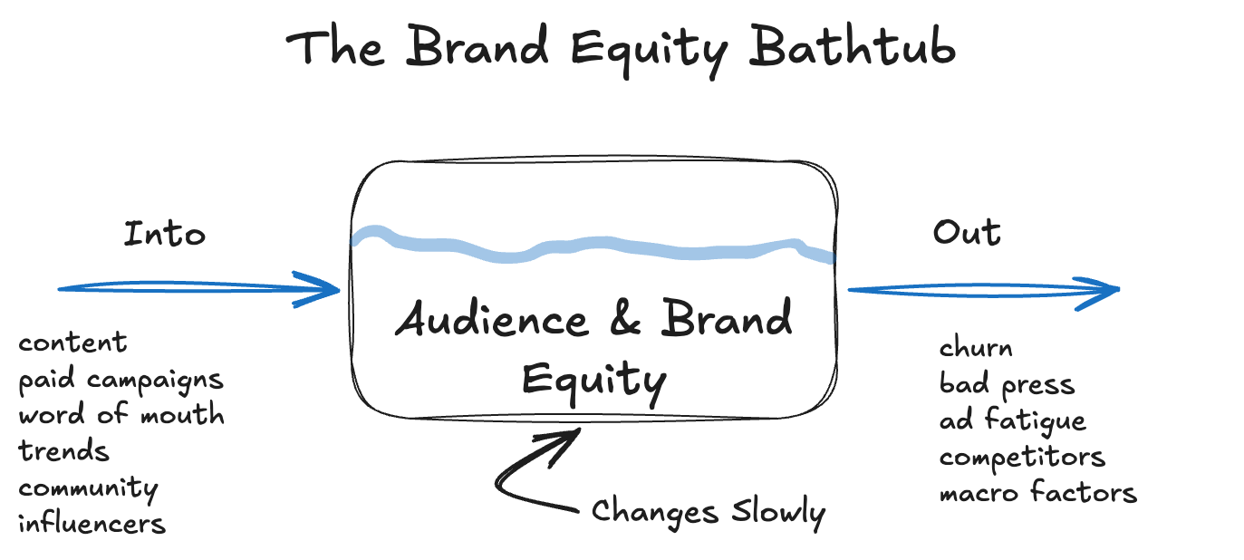 A rough heuristic: flows show up in weekly KPIs (net new subscribers, lead velocity, MQL rate). Stocks show up in quarterly metrics (total engaged database, share of search, brand awareness index). If you're only ever looking at weekly numbers, you're watching flows and ignoring the bathtubs they're filling.