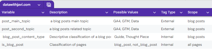 post_main_topic: This defines the primary topic of a blog post. For example, this blog post will be categorized under "GA4" since it’s primarily focused on Google Analytics 4.