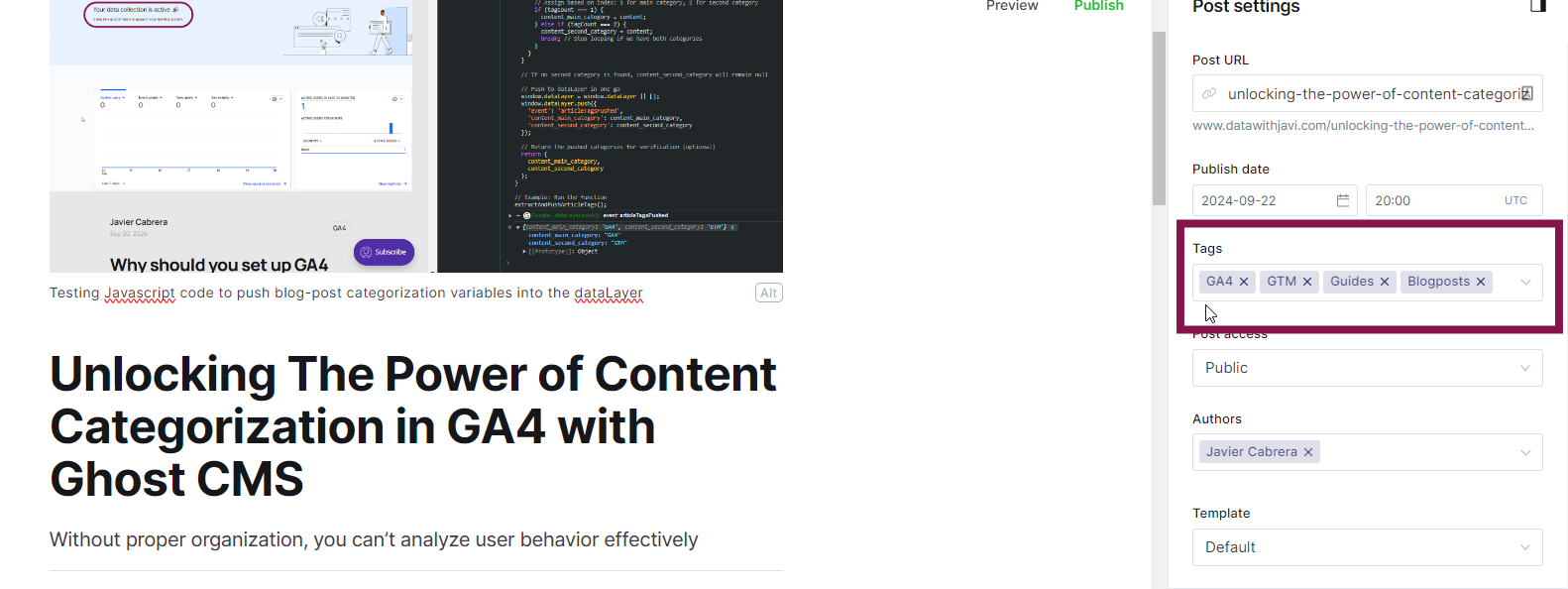Ghost CMS by default does not allow us to create attributes to be used to categorize our content. However, we can leverage the order in which we apply our tags to a post or page for our GA4 categorization.