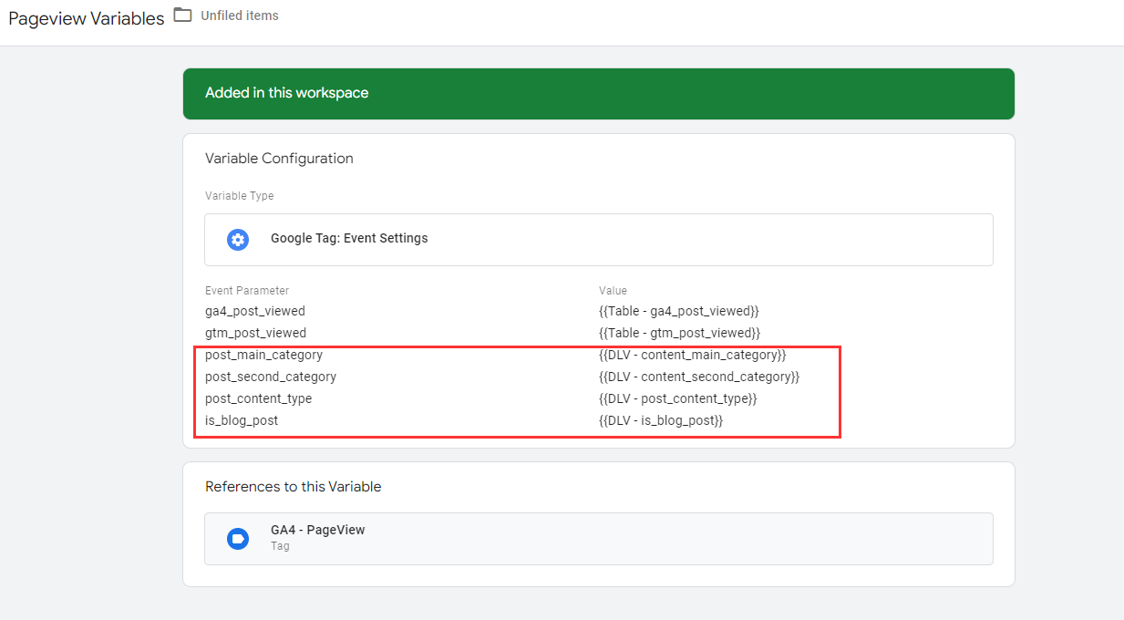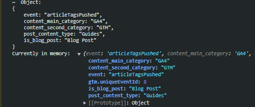 });Here, the extracted data is sent to the dataLayer. This lets analytics tools like GA4 access the information about the post’s content categories and type. This will push a dataLayer event named "articleTagsPushes" that will contain 4 categorization variables. Easily accesible through GTM.